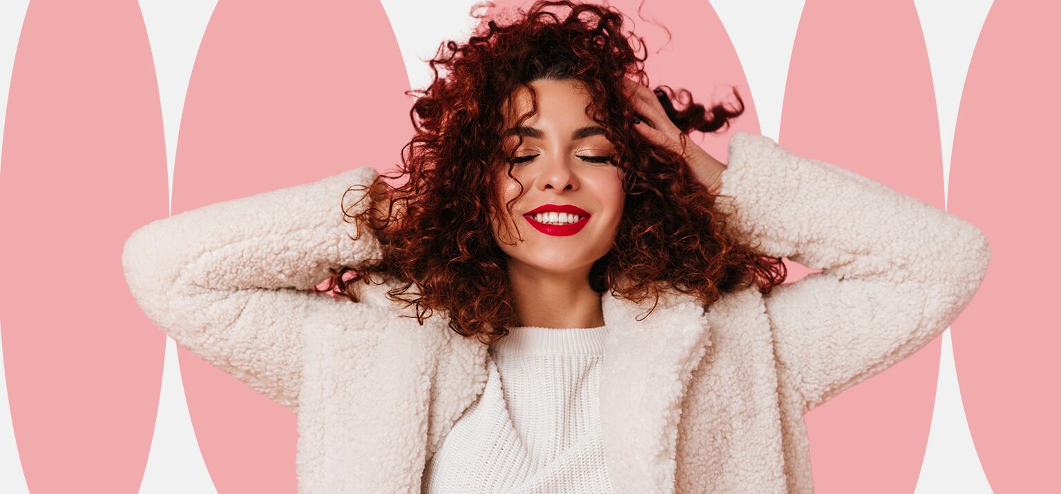 Mulher sorrindo com cabelos cacheados e ilustrações de cabelos